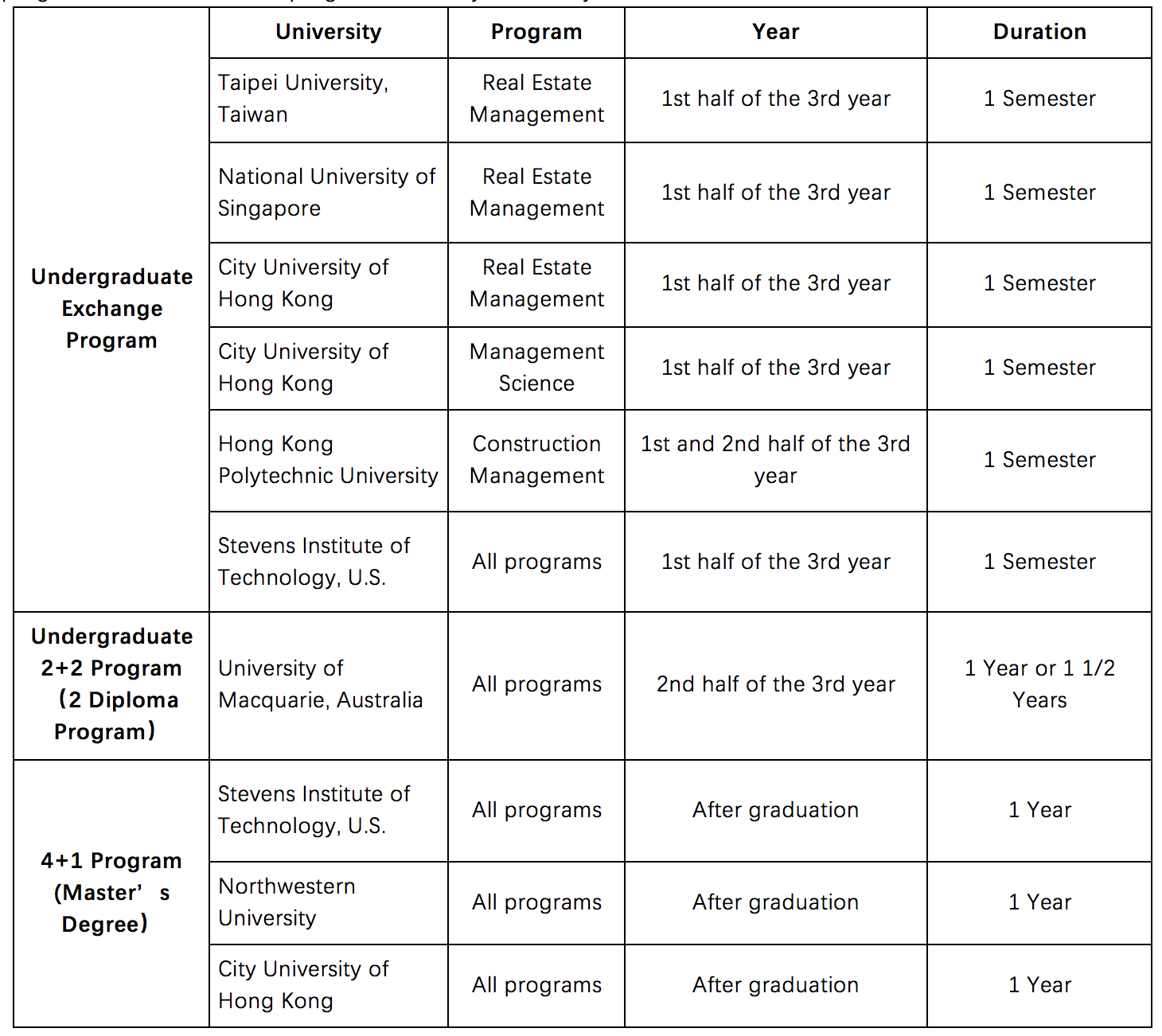 The School of Management Science and Engineering was established in December 2006, which was formerly the fourth dedicated program, Capital Construction Economics, that the Central University of Finance and Economics (CUFE) founded in 1984. It is an integrated teaching and research program system based on the development of four main disciplines: Investment, Construction Management, Project Management, Real Estate Management and Management Science. Relying on CUFE’s ideal background, the school has formed its own distinctive feature and advantages. 1. Departments (1) Academic Departments The School consists of 5 departments, namely Department of Construction Management, Department of Project Management, Department of Urban and Real Estate Management and Department of Management Science. (2) Research Institutions In addition to the general teaching facilities, the School has six research institutions, including the Investment Project Management Center, the Institute of Management Science, the Real Estate Research Institute, the Urban Economic Research Institute, the Private Equity Investment Research Institute and the Research Institute for Policy Effectiveness. 2. Faculty The School attaches great importance to the formation and optimization of our faculties through intensive training and effective recruitment, focusing on building a team with strong teaching and research skills, as well as international perspectives. On the one hand, the potential of the current teachers is developed by encouraging them to participate in workshops, training, further education and academic conferences; on the other hand, attracting new talents is the key to strengthen the existing team. The School is taking into consideration of a variety of aspects to guide the training and recruitment, such as the structure of the team in terms of departments, programs, academic origins, age, education backgrounds, titles and research areas. A young and capable faculty has largely been built, with essential academic origins, teaching skills, research potential, international perspectives, creativity, and ability. By the end of 2016, the School of Management Science and Engineering has 55 staffs, among whom 45 are professional teachers, 10 are administration and assistant staffs. Among the professional teachers, there are 13 professors, 24 associate professors, 34 young and middle-aged teachers under the age of 45, more than 60% of whom have more than half a year of overseas experience as visiting scholars. One of them was selected by the "New Century Excellent Talents Program”, organized by the Ministry of Education, while another 3 was selected by the "Beijing Outstanding Talent Supporting Program”. In recent years, 9 talents with doctoral degree are recruited as full-time faculties, graduated from top-ranking universities such as the Northwestern University, the Royal Swedish Institute of Technology, and the National University of Singapore. From 1 January 2012 to 31 December 2016, our faculties have been working on 23 programs for the National Natural Science Foundation of China, 2 programs for the National Planning Office of Philosophy and Social Science, and 30 provincial and ministerial level projects, securing 27.19 million yuan of funding. They published more than 50 high-level papers in SSCI journals, SCI journals, and Category-A journals of the National Natural Science Foundation of Management Science, as well as 19 academic monographs, which attracted broad attention in the academic field and have a great economic and social impact. 3. Degree Program The School has currently formed a multi-level and multi-channel teaching system, mainly consisting of full-time undergraduate programs, master's degree programs, doctoral degree programs, as well as various international cooperation programs. We have cultivated a group of high-level personnel in the area of economics and management with comprehensive skillset to serve our national and social development needs. By the end of 2016, there are 798 full-time students, 123 of whom are full-time post-graduate students (16 are on a doctoral degree path and 107 are on a master’s degree path) and 675 undergraduates. (1) Bachelor’s Degree The School offers 4 undergraduate programs in Investment, Management, Real Estate Management , and Construction Management. (2) Master’s Degree The School offers 4 Master’s programs in Management Science and Engineering, Investment, Engineering Project Management, Real Estate Economics and Management. (3) Doctoral Degree The School offers doctoral program for Investment. 4. International Cooperation The School paid much attention to globalize our programs, and joint agreements on undergraduate and Master’s programs have been signed with well-known universities abroad to foster cooperation in many forms. More than 35% of our undergrads have access to international exchange opportunities, relying on the agreements the School signed on international undergraduate exchange and joint training programs. If undergraduate exchange programs provided by the University are included, more than 50% of our students can participate in overseas programs. The international programs currently offered by the School include: