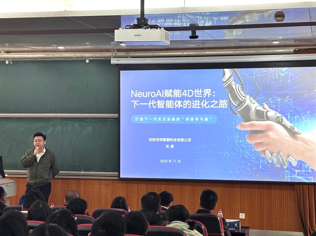 知躍空間聯(lián)合創(chuàng)始人、高級工程師張展以《神經(jīng)AI賦能四維世界:下一代智能體的進化之路》為題發(fā)表報告。他指出,實現(xiàn)具身智能是邁向通用人工智能(AGI)的關(guān)鍵步驟,AI正從“離身智能”向“具身智能”演進,這是其從語言世界理解走向物理世界交互的必然趨勢。張展對比了傳統(tǒng)大模型與具身智能模型在參數(shù)規(guī)模等方面的差異,指出當前行業(yè)仍面臨“數(shù)據(jù)鴻溝”、環(huán)境感知不敏銳等瓶頸,制約了大模型在物理任務中的遷移能力。他強調(diào),AI要形成類人認知,必須建立在對現(xiàn)實世界的直接感知基礎上。張展還分享了團隊在該方向的研究進展,包括發(fā)表于Nature子刊的線蟲神經(jīng)網(wǎng)絡學習理論研究,以及面向真實場景開發(fā)的高精度、實時四維場景重建世界模擬器。