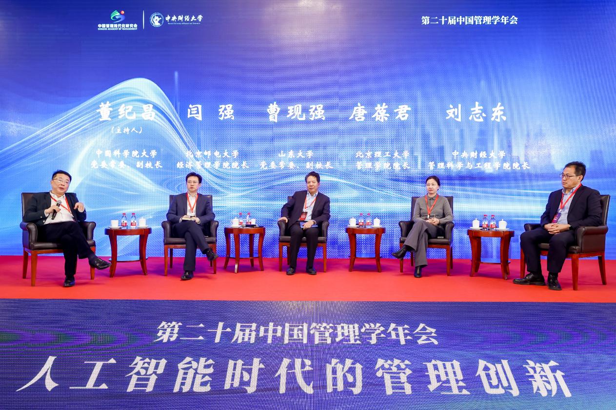 在校長(zhǎng)、院長(zhǎng)論壇環(huán)節(jié)中,中國(guó)科學(xué)院大學(xué)副校長(zhǎng)董紀(jì)昌教授,北京郵電大學(xué)經(jīng)濟(jì)管理學(xué)院院長(zhǎng)閆強(qiáng)教授,山東大學(xué)黨委常委、副校長(zhǎng)曹現(xiàn)強(qiáng)教授,北京理工大學(xué)管理學(xué)院院長(zhǎng)唐葆君教授、中央財(cái)經(jīng)大學(xué)管理科學(xué)與工程學(xué)院院長(zhǎng)劉志東教授就人工智能時(shí)代管理學(xué)教學(xué)、科研和人才培養(yǎng)等重要議題進(jìn)行深度研討。