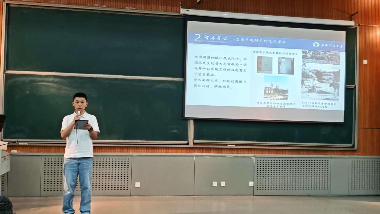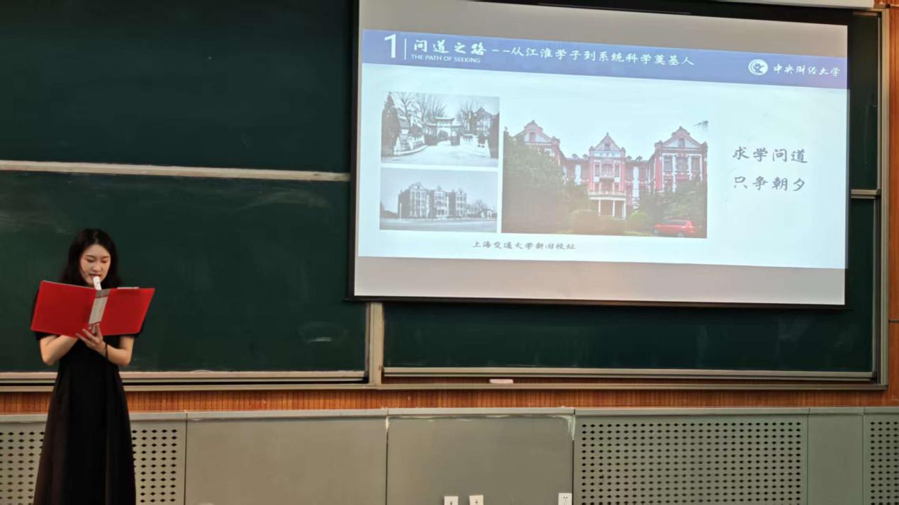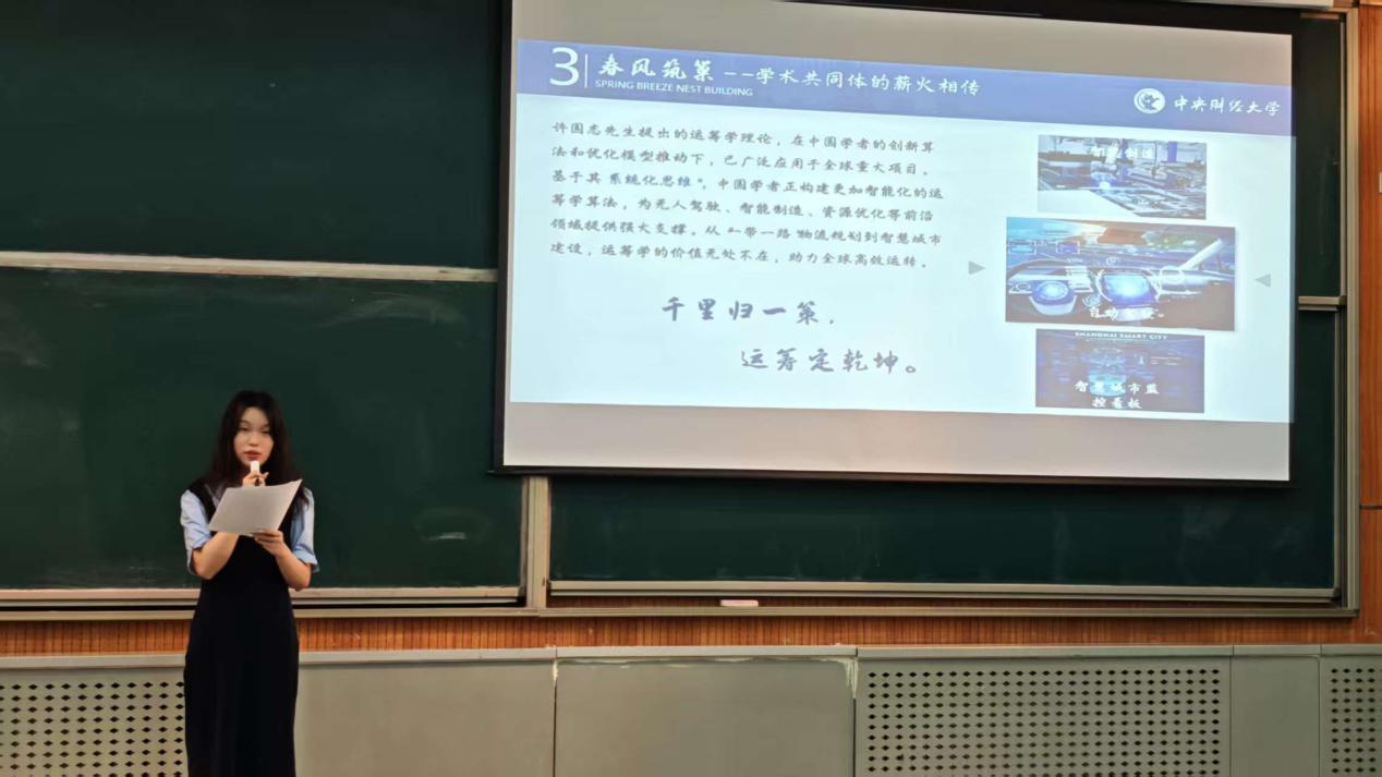 宣講活動由管理科學(xué)21級董熙蕾、許國志大數(shù)據(jù)英才班21級付博昕和王韻涵主講。宣講以問道之路--從江淮學(xué)子到系統(tǒng)科學(xué)奠基人、智啟星火--復(fù)雜系統(tǒng)研究的范式革命、春風(fēng)筑巢--學(xué)術(shù)共同體的薪火相傳和薪傳長河—大數(shù)據(jù)時代的守正創(chuàng)新分開講述了許國志先生的生平與求學(xué)深造經(jīng)歷、許國志先生為中國運籌學(xué)和系統(tǒng)工程的崛起做出的貢獻(xiàn)、許國志先生對我國的運籌學(xué)及系統(tǒng)工程專業(yè)學(xué)科建設(shè)及新生力量培養(yǎng)以及許國志先生的教育理念在中央財經(jīng)大學(xué)管理科學(xué)與工程學(xué)院中的體現(xiàn)和延續(xù)。
