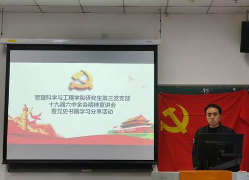 2021年12月3日,管理科學(xué)與工程學(xué)院研究生第三黨支部在主教402召開黨的十九屆六中全會精神宣講會暨黨史學(xué)習(xí)教育交流會。本次活動邀請到學(xué)校博士生宣講團(tuán)講師經(jīng)濟(jì)學(xué)院孟佳昕同學(xué)進(jìn)行主題為“勇?lián)?jīng)世濟(jì)民之使命,與國同行”的專題宣講,并對黨的十九屆六中全會精神和為期一個月的黨史學(xué)習(xí)教育進(jìn)行總結(jié)分享。會議由支部書記蔣博文主持,講師孟佳昕、研究生第三黨支部全體黨員、入黨積極分子共17人參加會議。