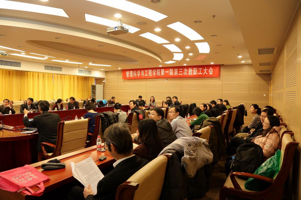 2013年12月22日管理科學(xué)與工程學(xué)院在學(xué)術(shù)會(huì)堂604召開第一屆第三次教職工大會(huì)。大會(huì)由教職工大會(huì)執(zhí)委會(huì)主任、黨總支書記賀小海主持,副校長王瑤琪以及學(xué)院全體教職工出席會(huì)議。