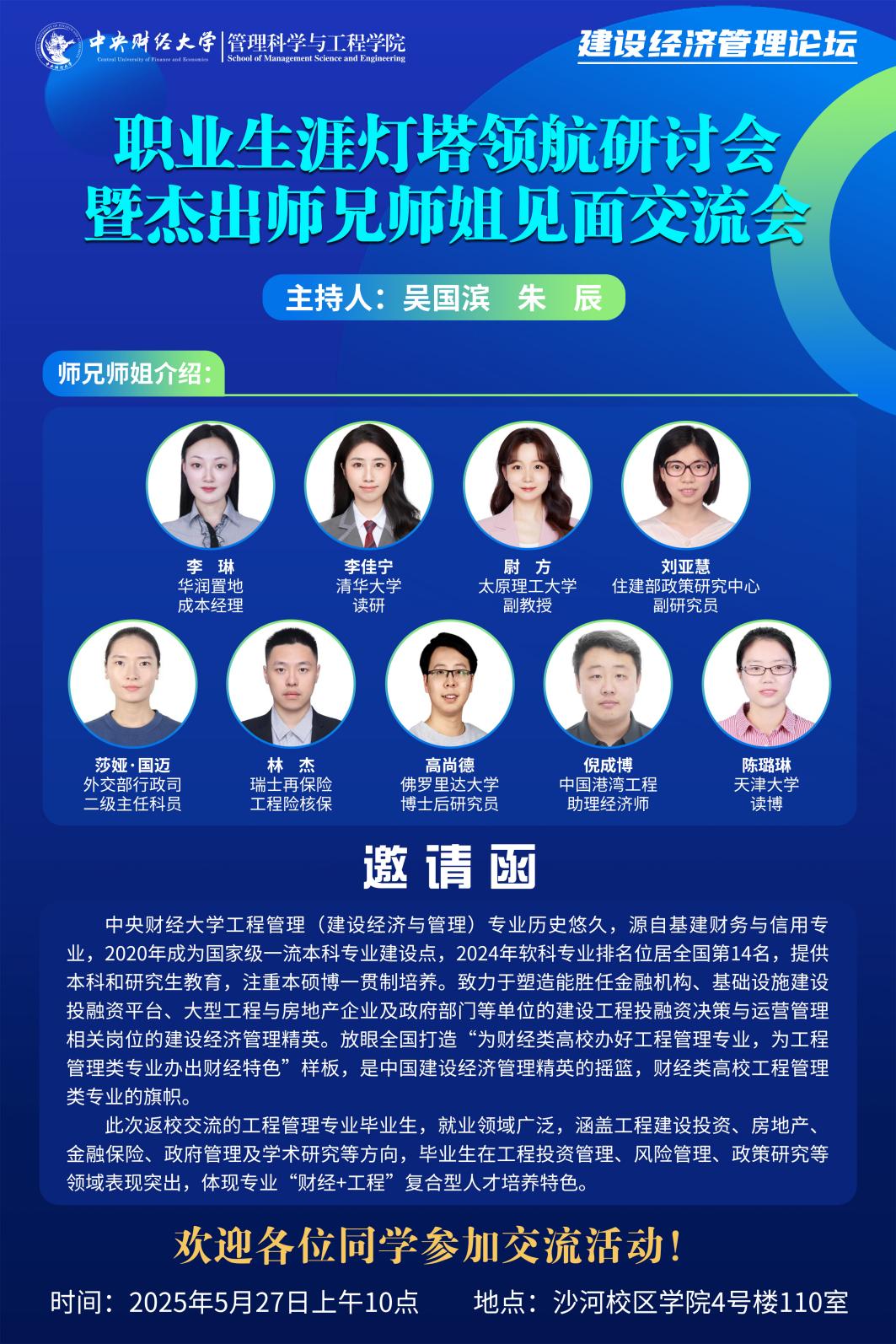 活動(dòng)邀請(qǐng)到來(lái)自不同領(lǐng)域的杰出校友,包括華潤(rùn)置地成本經(jīng)理李琳、太原理工大學(xué)副教授尉方、住建部政策研究中心副研究員劉亞慧、外交部行政司二級(jí)主任科員莎婭·國(guó)邁、瑞士再保險(xiǎn)工程險(xiǎn)核保林杰、佛羅里達(dá)大學(xué)博士后研究員高尚德、中國(guó)港灣工程助理工程師倪成博、天津大學(xué)博士生陳璐琳、清華大學(xué)在讀研究生李佳寧。在交流環(huán)節(jié),工程管理專業(yè)的本科生們踴躍提問(wèn),內(nèi)容涵蓋升學(xué)規(guī)劃、職業(yè)選擇、工作環(huán)境、職業(yè)發(fā)展以及大學(xué)生活中的學(xué)業(yè)、實(shí)習(xí)與情感等方面。校友們結(jié)合自身經(jīng)歷,為師弟師妹們提供了寶貴的建議。