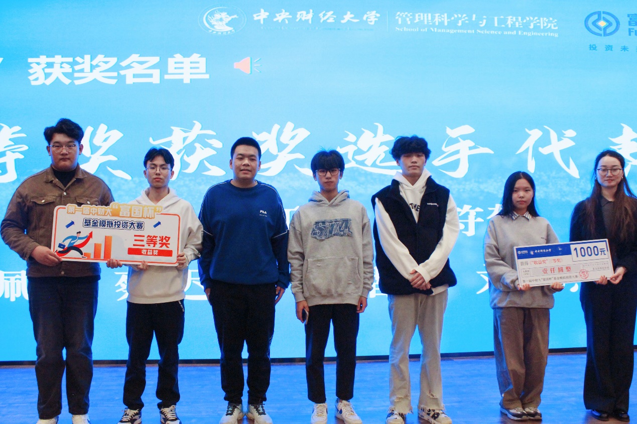 頒獎環(huán)節(jié)中,主持人宣讀了中財大“富國杯”基金模擬投資大賽第一屆全程賽“收益獎”和“財經(jīng)視頻獎”的獲獎選手名單,由嘉賓依次為獲獎同學頒發(fā)證書,并與獲獎同學合影留念。