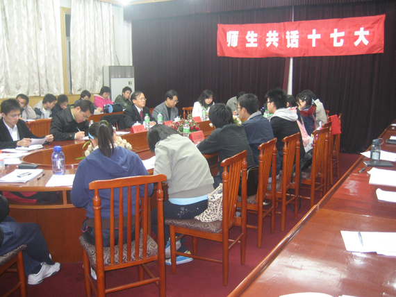 11月2日晚,由中國(guó)青年政治學(xué)院團(tuán)委主辦,朝實(shí)社、時(shí)政協(xié)會(huì)承辦的 “師生共話十七大”座談會(huì)在圖書館二樓會(huì)議室舉行。黨的十七大代表、中國(guó)青年政治學(xué)院鐘德壽教授為同學(xué)們解讀了十七大報(bào)告的主要精神,并向大家講述了參會(huì)情況和感受。中國(guó)青年政治學(xué)院黨委常委、副院長(zhǎng)李家華出席座談會(huì)并講話。我院嘹望社應(yīng)邀參加了此次座談會(huì)。