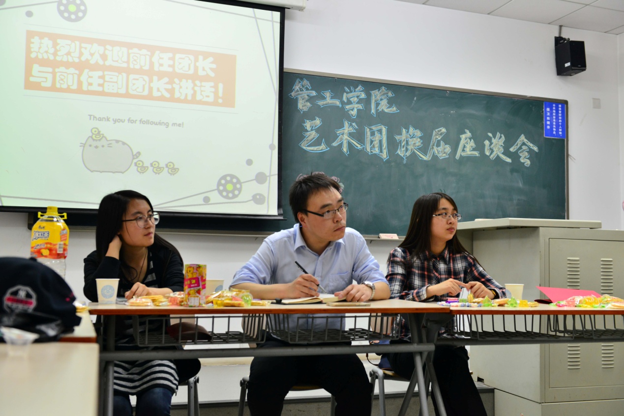 今年是管工學(xué)院藝術(shù)團(tuán)成立的第二年,它是為數(shù)不多的學(xué)院級別的藝術(shù)團(tuán)體之一。而這是藝術(shù)團(tuán)的第二次換屆座談會。合唱團(tuán)、舞蹈團(tuán)、主持人團(tuán)的成員齊聚一堂,一場別開生面的座談會就在這樣一個晴朗的午后在學(xué)院三號樓218召開。學(xué)院團(tuán)總支書記薄璐、團(tuán)總支副書記王思維老師參加了本次座談會。