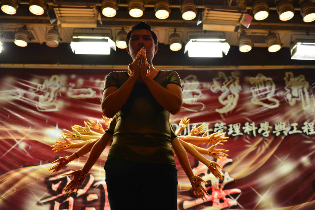 從夜空把心靈拉回地面,由張妍、宋敬儀和若扎分別帶來(lái)的舞蹈《思鄉(xiāng)》、《聽(tīng)》和《撒糖舞》又帶來(lái)一場(chǎng)視覺(jué)的盛宴。草原女子的活潑抑或水鄉(xiāng)女子的溫婉,都是那樣讓人喜愛(ài)。接著便迎來(lái)了工程12班富有趣味的《千手觀音》。古銅色的身體站成一列,目力所及的是金色飛舞的千只手在回旋、綻放,格外莊嚴(yán)與壯觀。而其后“千手觀音”對(duì)《上海灘》、《不怕不怕》與《流星雨》的詮釋卻又即刻拉近了舞者與觀眾的距離,多了些搞怪、多了些歡笑。最后千手觀音在觀眾們叫好聲中退場(chǎng)。