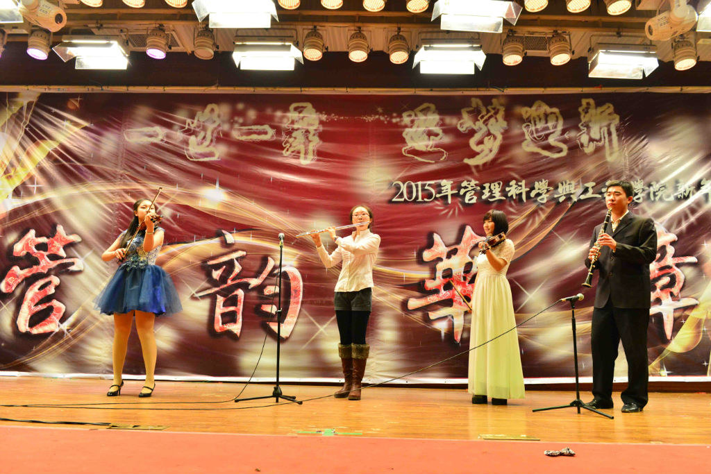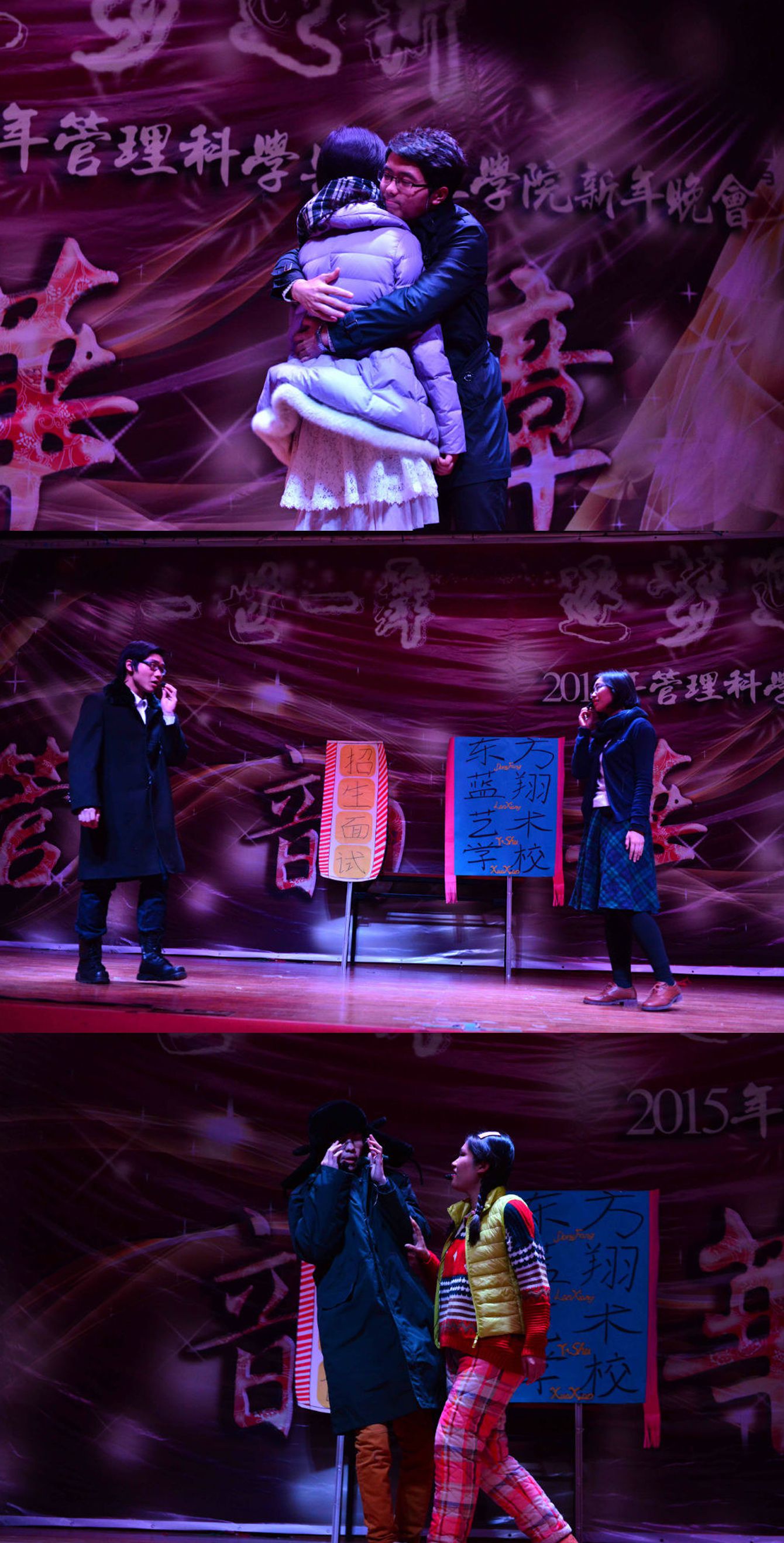 看他們,“風(fēng)翻白浪花千片,雁點(diǎn)青天字一行”的氣場(chǎng);看他們,“山明水靜夜來(lái)霜,數(shù)樹(shù)深紅出淺黃”的張揚(yáng)!當(dāng)2014的腳步漸行漸遠(yuǎn),管理科學(xué)與工程學(xué)院又將迎著嶄新的2015,跳出一支怎樣的驚鴻舞?12月21日,學(xué)院在金色大廳成功舉辦2015年新年晚會(huì),為大家呈上了一場(chǎng)視聽(tīng)的盛宴。院長(zhǎng)李文斌,黨總支書(shū)記賀小海,副院長(zhǎng)劉志東,黨總支副書(shū)記賈傳亮,組織員晏政、院長(zhǎng)助理陳俊華,教學(xué)辦公室主任馬繼榮,項(xiàng)目管理系主任宋硯秋,班主任王昊、汪濤、韓璐,學(xué)生工作辦公室主任張志祥,團(tuán)總支書(shū)記薄璐,輔導(dǎo)員林嘉祥、王思維等領(lǐng)導(dǎo)和老師與全院同學(xué)一共觀看了晚會(huì)。