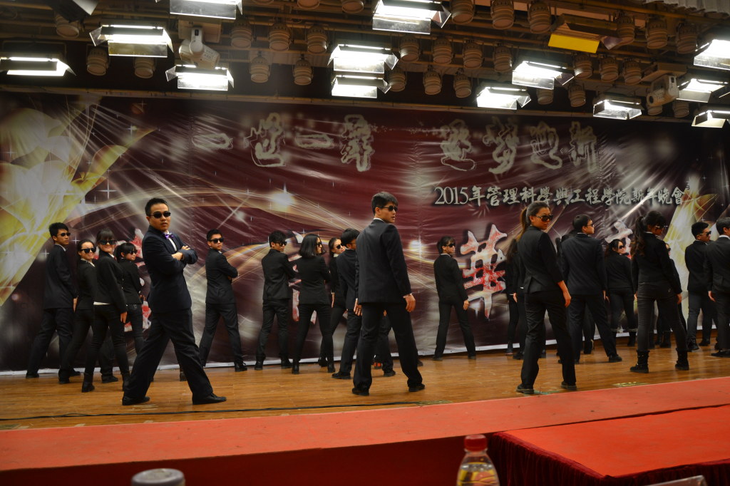 晚會(huì)開(kāi)始前半小時(shí),金色大廳里已是高朋滿座。此時(shí),華燈將一切彩光收起,將一片神秘和遐想灑向觀眾。當(dāng)燈光再次亮起的時(shí)候,臺(tái)上團(tuán)總支學(xué)生會(huì)的學(xué)生干部們一身帥氣西裝,瞬間吸引了所有人的眼球。動(dòng)感勁爆的音樂(lè)與交織穿梭的燈光相得益彰,夜晚神秘嫵媚的輪廓就這樣被刻畫(huà)得淋漓盡致。管工學(xué)院吉祥物馬里奧也在此時(shí)進(jìn)入金色大廳,與現(xiàn)場(chǎng)觀眾互動(dòng)。就讓我們從這里開(kāi)始,探尋2015的未知和秘密!