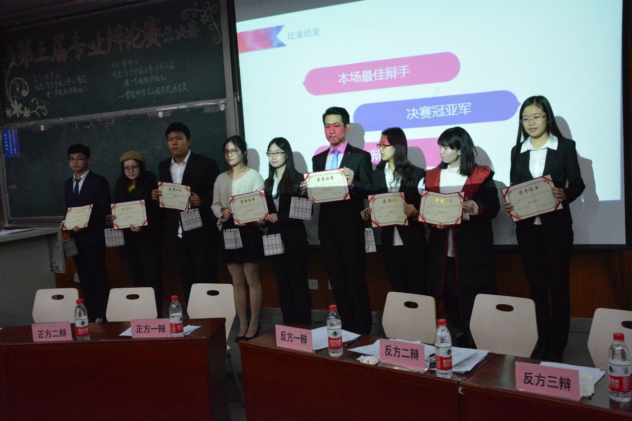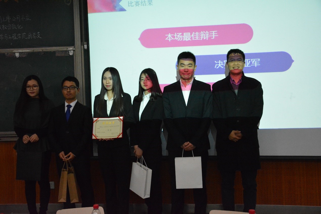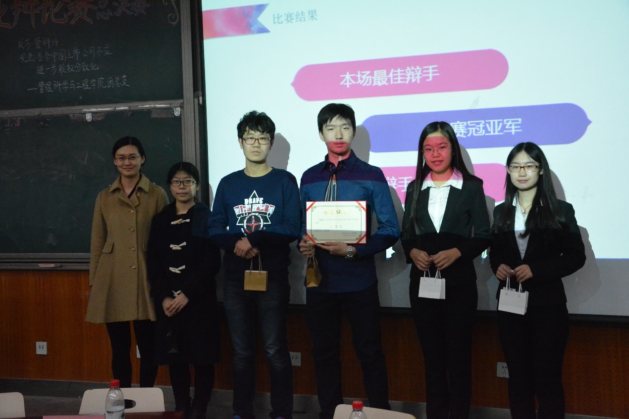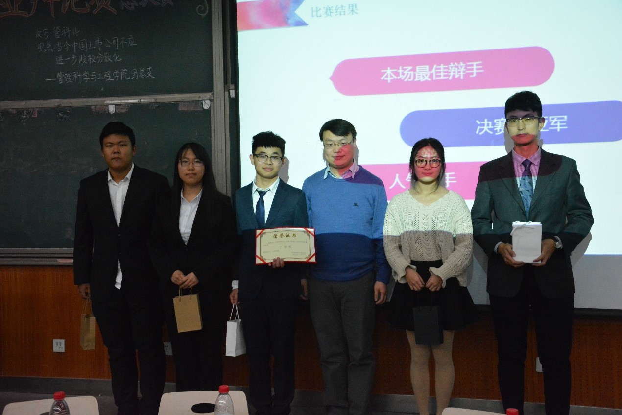 最終,經(jīng)過(guò)評(píng)委的討論和現(xiàn)場(chǎng)點(diǎn)評(píng),管理科學(xué)14以其優(yōu)異的表現(xiàn)獲得比賽的勝利,正方四辯李天昊憑借其敏捷縝密的思維和沉穩(wěn)的氣質(zhì)獲得最佳辯手的榮譽(yù)。