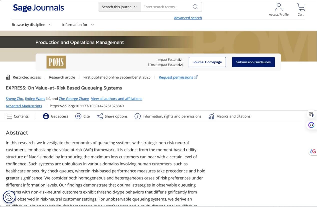 近日,我院王金亭教授作為通訊作者,與合作者河南理工大學(xué)朱盛副教授和西華盛頓大學(xué)(Western Washington University)Zhe George Zhang教授撰寫的題為On Value-at-Risk Based Queueing Systems的學(xué)術(shù)論文,被國(guó)際權(quán)威期刊Production and Operations Management (POM)接收并在線發(fā)表,這是王金亭教授研究團(tuán)隊(duì)今年在POM上發(fā)表的第二篇論文。