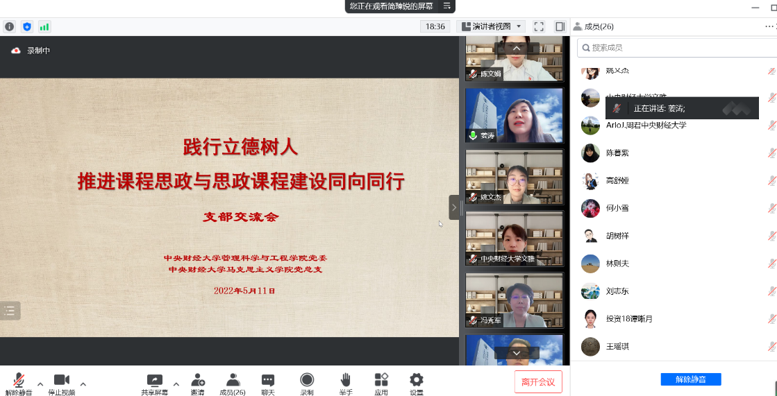 在交流環(huán)節(jié)上,投資系教工黨支部成員謝娜和思想道德與法治教研室黨支部成員劉亞瓊分別做了《扎根中國(guó)大地的投資學(xué)》的課程思政和《共產(chǎn)主義是虛無(wú)縹緲的嗎?》的思政課程展示。參會(huì)的老師和學(xué)生們圍繞兩位老師的展示內(nèi)容和課程建設(shè)等積極發(fā)表見(jiàn)解、分享感受。管理科學(xué)與工程學(xué)院教師歐變玲、荊中博,學(xué)生杜添睿和譚晰月,馬克思主義學(xué)院教師胡樹(shù)祥、謝玉進(jìn)、文雅分別做了發(fā)言。胡樹(shù)祥教授在此環(huán)節(jié)用“三個(gè)堅(jiān)持”總結(jié)了如何更好推動(dòng)課程思政與思政課程同向同行,即堅(jiān)持履行好立德樹(shù)人的職責(zé)、堅(jiān)持馬克思主義立場(chǎng)觀點(diǎn)和方法、堅(jiān)持理論與實(shí)際的結(jié)合。