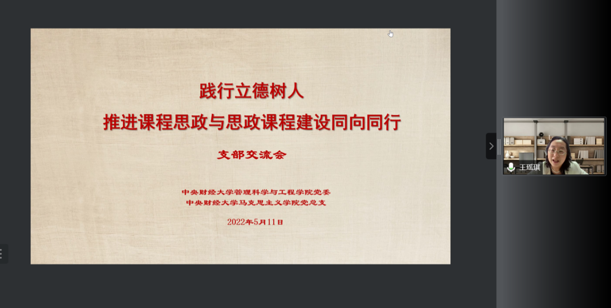 5月11日下午,管理科學(xué)與工程學(xué)院與馬克思主義學(xué)院聯(lián)合舉辦的“踐行立德樹(shù)人 推進(jìn)課程思政與思政課程建設(shè)同向同行”會(huì)議在線上順利召開(kāi),本次會(huì)議以黨支部交流的形式展開(kāi)。王瑤琪校長(zhǎng),管理科學(xué)與工程學(xué)院黨委書(shū)記姜濤、院長(zhǎng)劉志東,馬克思主義學(xué)院黨總支書(shū)記陳文娟、院長(zhǎng)馮秀軍,管理科學(xué)與工程學(xué)院投資系教工黨支部、馬克思主義學(xué)院思想道德與法治教研室黨支部全體黨員,雙方的師生代表等參加了本次會(huì)議,會(huì)議由投資系教工黨支部書(shū)記宋斌和思想道德與法制教研室黨支部書(shū)記簡(jiǎn)臻銳主持。