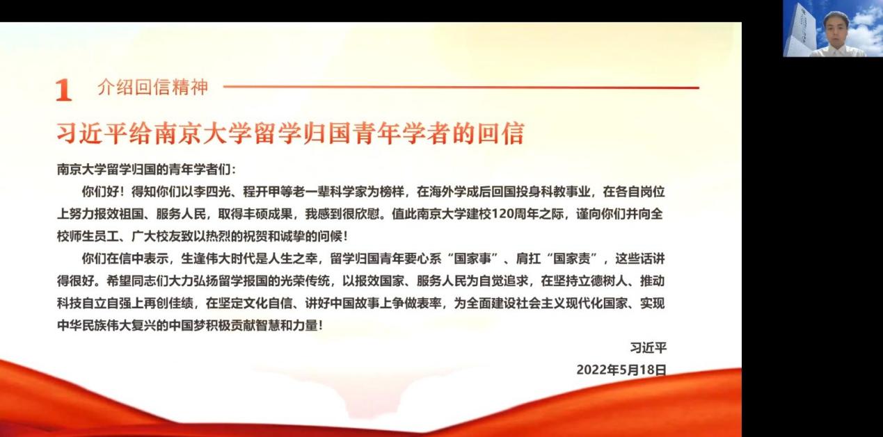 為深入學(xué)習(xí)貫徹習(xí)近平總書記給南京大學(xué)留學(xué)歸國(guó)青年學(xué)者重要回信精神,增強(qiáng)師生黨員對(duì)于留學(xué)報(bào)國(guó)光榮傳統(tǒng)中的愛國(guó)主義精神的理解,2022年6月30日,管理科學(xué)與工程學(xué)院黨委理論學(xué)習(xí)中心組、建設(shè)經(jīng)濟(jì)與管理系教工黨支部、研究生第三黨支部聯(lián)合舉辦了學(xué)習(xí)《習(xí)近平總書記給南京大學(xué)留學(xué)歸國(guó)青年學(xué)者的回信》精神專題交流會(huì)。本次交流會(huì)由研究生第三黨支部書記蔣博文主持。