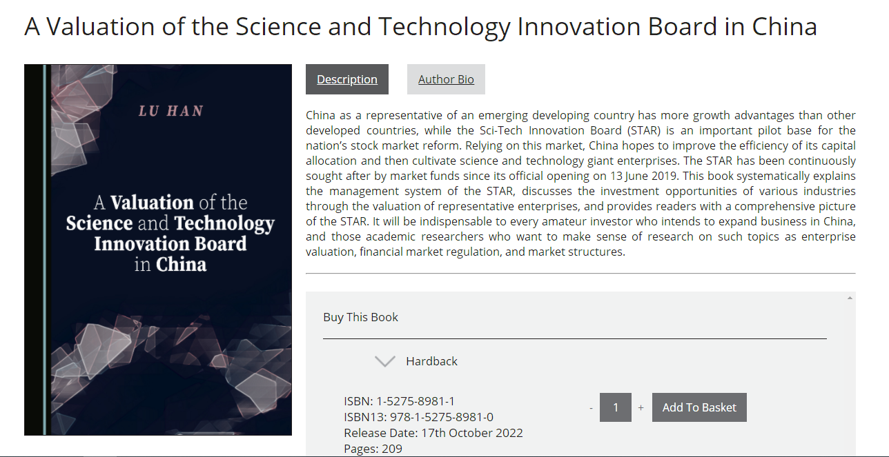 我院韓璐副教授的全英文學(xué)術(shù)專著《A Valuation of the Science and Technology Innovation Board in China》近日在英國Cambridge Scholars Publishing出版社面向國內(nèi)外公開出版。該專著的出版由Cambridge Scholars Publishing出版社提供邀請,通過出版社組織的5位專家匿名評審,獲得出版資助立項(資助立項率約為20%),用時2年完成書稿撰寫,經(jīng)過兩輪出版社組織的spot check最終定稿。