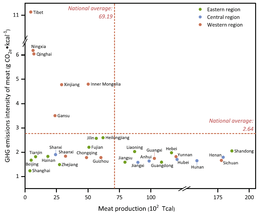 本研究采用基于過程的生命周期模型量化中國(guó)肉類產(chǎn)品的省級(jí)溫室氣體排放。我們考慮了四種主要畜禽產(chǎn)品(牛肉、羊肉、雞肉和豬肉)在四種養(yǎng)殖規(guī)模(散養(yǎng)、小規(guī)模、中等規(guī)模和大規(guī)模養(yǎng)殖)下的排放場(chǎng)景。結(jié)果表明:2018年,我國(guó)畜牧業(yè)的溫室氣體排放量為4.29億噸二氧化碳當(dāng)量(CO2e)。牛肉的溫室氣體排放強(qiáng)度最高(19.6 kg CO2e/kg),其次是羊肉(10.0 kg CO2e/kg)、雞肉(4.4 kg CO2e/kg)和豬肉(3.8 kg CO2e/kg)。從空間上看,中國(guó)西北部的畜牧業(yè)溫室氣體排放強(qiáng)度較高,為5.58g CO2e/kcal,而東部和中部地區(qū)的排放強(qiáng)度較低(分別為1.89和1.71g CO2e/kcal)。在省級(jí)層面,山東(3820萬噸CO2e)畜牧業(yè)的溫室氣體排放量最高,而上海(50萬噸CO2e)的排放量最低。本研究確定了肉類產(chǎn)品全生產(chǎn)鏈的溫室氣體排放熱點(diǎn),揭示了我國(guó)肉類溫室氣體排放的空間模式,助力我國(guó)畜牧業(yè)的低碳轉(zhuǎn)型。