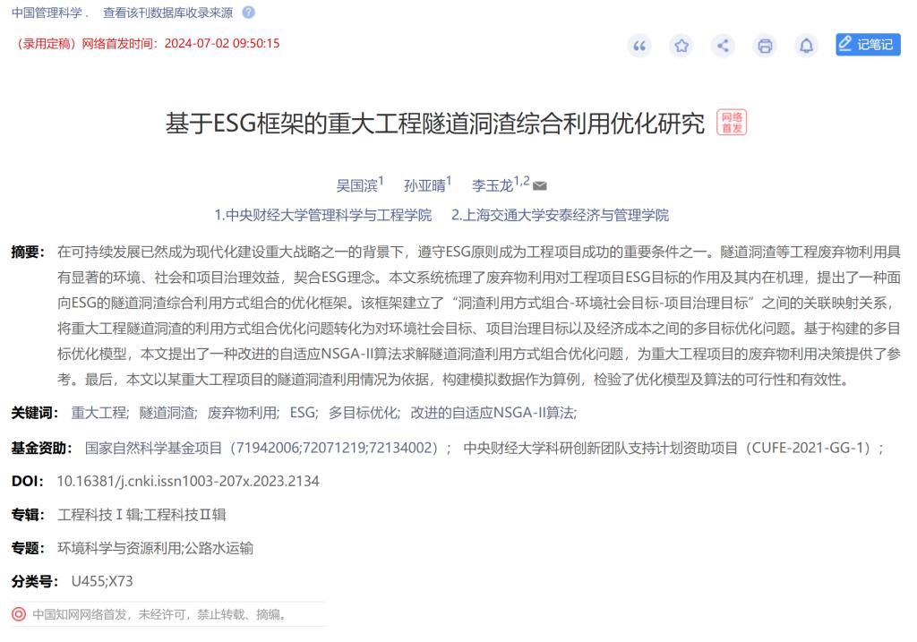 近日,我院2022級工程管理專業(yè)本科生孫亞晴與青年教師吳國濱(第一作者)、李玉龍教授(通訊作者)合作的學術論文“基于ESG框架的重大工程隧道洞渣綜合利用優(yōu)化研究”被管理領域知名期刊《中國管理科學》(2023版復合影響因子6.683,CSSCI,F(xiàn)MST1,自然基金委管理學部A級重要期刊)錄用,并網(wǎng)絡首發(fā)(網(wǎng)絡首發(fā)地址:https://link.cnki.net/urlid/11.2835.G3.20240701.1543.001)。
