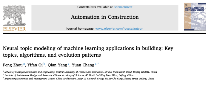 近日,我系教師題為“Neural topic modeling of machine learning applications in building: Key topics, algorithms, and evolution patterns”的研究論文,在智能建造領(lǐng)域國際頂級期刊《Automation in Construction》(中科院一區(qū)Top,影響因子9.6)發(fā)表,該期刊位居全球SCIE收錄的181種土木工程類期刊第1位。論文第一作者為建設(shè)經(jīng)濟(jì)與管理系周鵬副教授,第二作者為2022級碩士研究生漆一凡,通訊作者為常遠(yuǎn)教授。