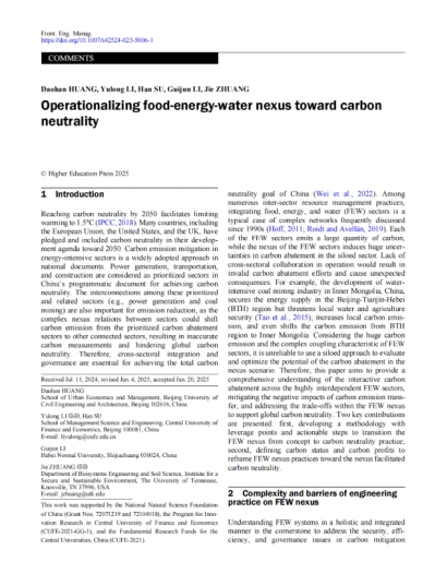我院畢業(yè)生黃道涵副教授與李玉龍教授合作學術論文“Operationalizing food-energy-water nexus toward carbon neutrality”被中國工程院院刊《Frontiers of Engineering Management》(FMS-A類、中科院一區(qū)TOP)正式發(fā)表。