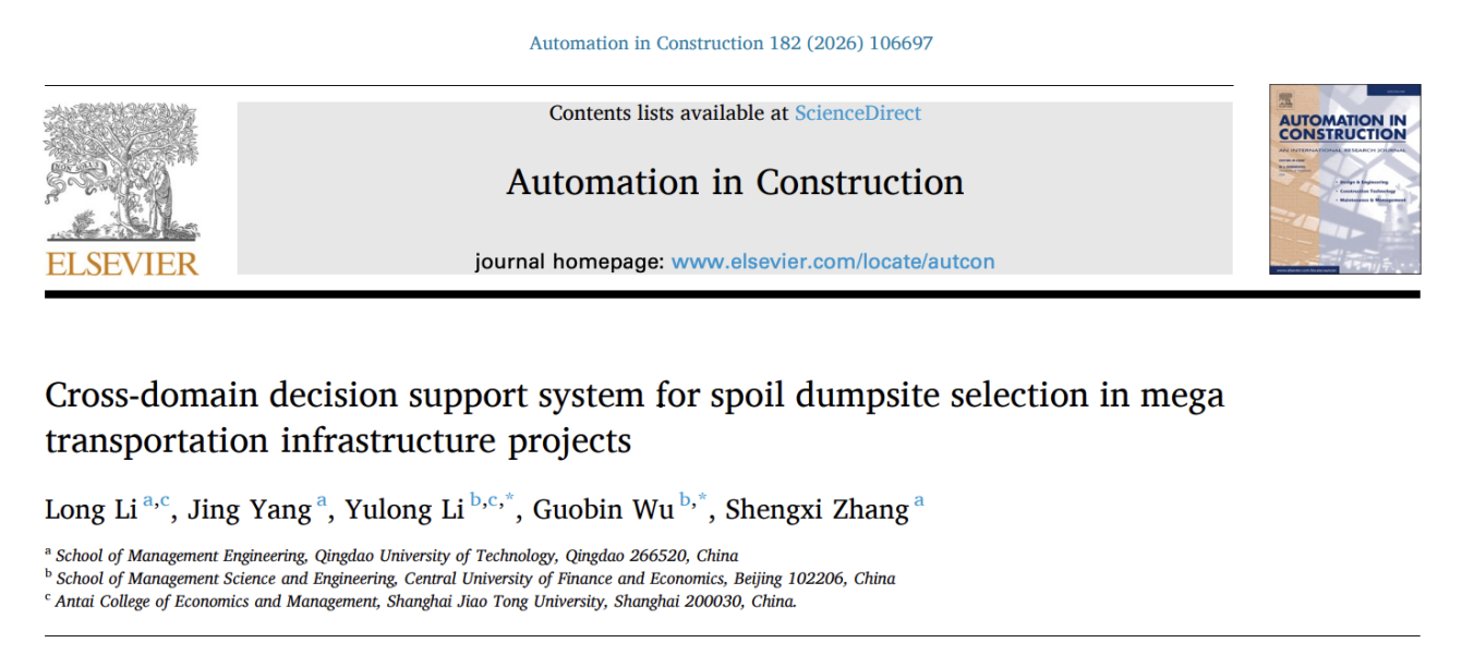 論文信息:Li, L., Yang, J., Li, Y., Wu, G., & Zhang, S. (2026). Cross-domain decision support system for spoil dumpsite selection in mega transportation infrastructure projects.Automation in Construction,182, 106697.