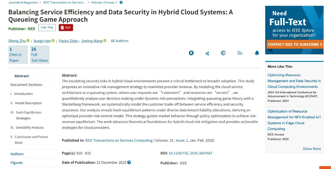 近日,我院王金亭教授團隊在中央財經(jīng)大學(xué)AAA期刊《IEEE Transactions on Services Computing》發(fā)表題為“Balancing Service Efficiency and Data Security in Hybrid Cloud Systems: A Queueing Game Approach”的學(xué)術(shù)論文。朱盛副教授為第一作者,王金亭教授為通訊作者,研究生韓雪鴿、趙一潛為共同作者。