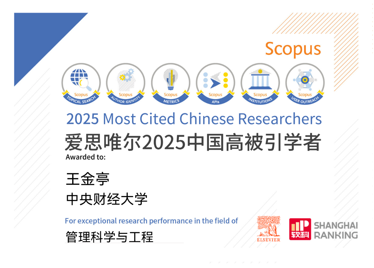 2026年1月30日,國際知名學(xué)術(shù)出版集團(tuán)愛思唯爾 (Elsevier)發(fā)布了2025“中國高被引學(xué)者”榜單,我院王金亭教授再次入選“管理科學(xué)與工程”榜單。2021年以來,王金亭教授四次入選愛思唯爾“中國高被引學(xué)者”榜單。